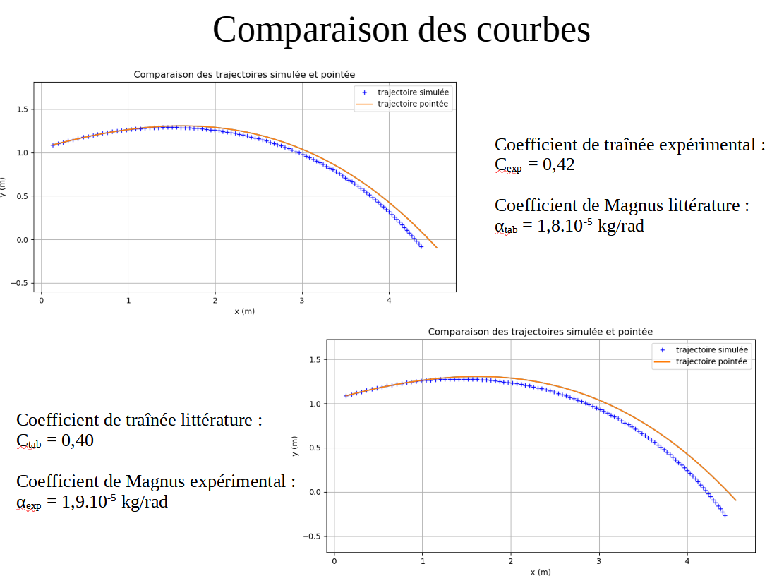 D'autre part, nous avons écrit un programme Python permettant de modéliser la trajectoire théorique de la balle en fonction de la vitesse de lancer et de la vitesse de rotation. Ainsi, nous pouvons comparer la trajectoire de la balle que nous devrions observer avec la valeur des coefficients que nous avons trouvé précédemment, avec la trajectoire filmée de la balle. On observe que ces deux courbes sont assez proches, la trajectoire filmée correspond à la trajectoire modélisée, nos coefficients sont donc satisfaisants.