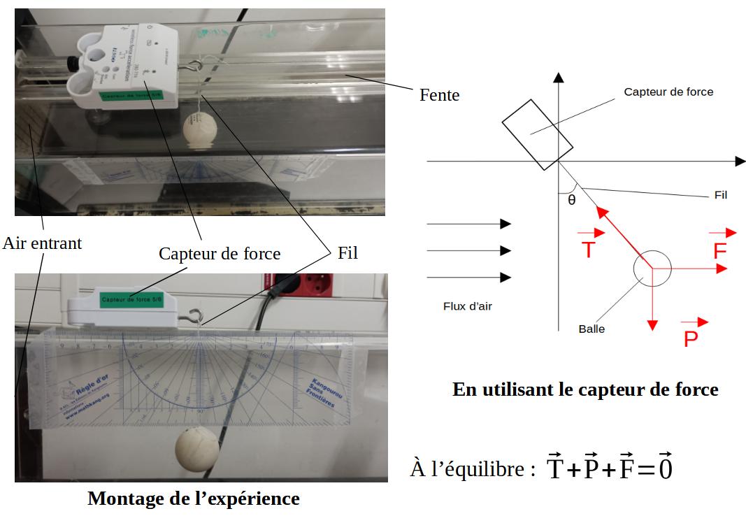 Pour déterminer le coefficient de frottement, nous avons attaché la balle à une ficelle dans la soufflerie de notre lycée. En faisant passer de l'air dans la soufflerie, la balle se soulève grâce à la force de frottement, et nous pouvons mesurer l'angle formé par la ficelle avec la verticale lorsque la balle est à l'équilibre.